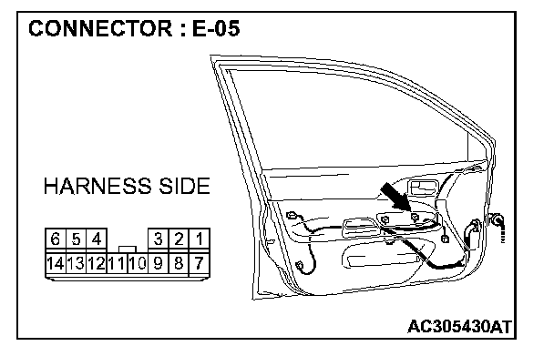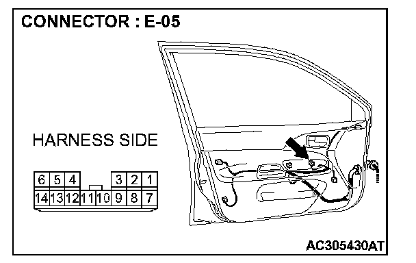 STEP 30. Check the wiring harness between power window main switch connector E-05 (terminal 4 and 6) and power window sub-switch (rear: RH) connector E-17 (terminal 8 and 5).
