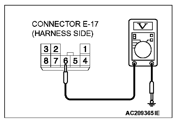 1. Disconnect power window sub-switch (rear: RH) connector E-17 and measure the voltage available at the wiring harness side of the connector.