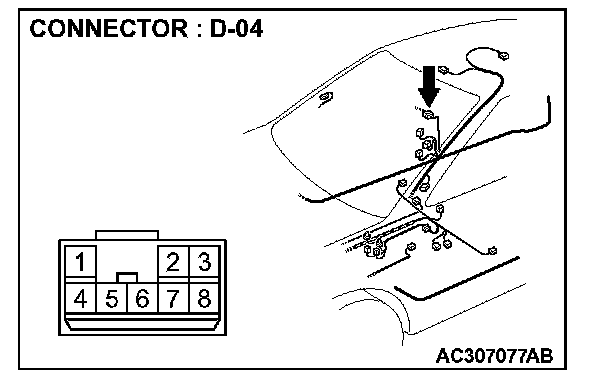 1. Disconnect power window sub-switch (rear: LH) connector E-08 and measure the resistance available at the wiring harness side of the connector.