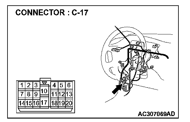 1. Disconnect power window sub-switch (rear: RH) connector E-17 and measure the resistance available at the wiring harness side of the connector.