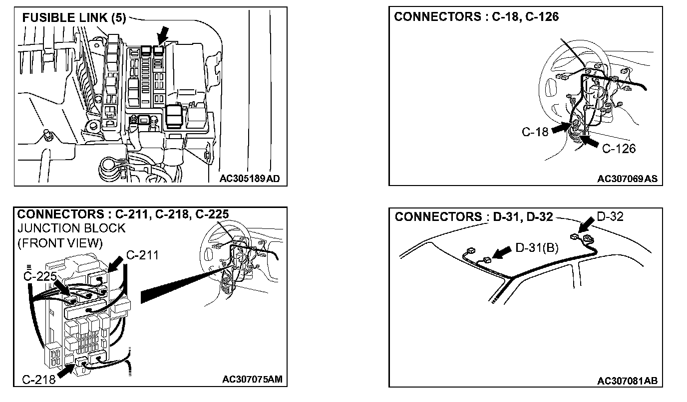 STEP 2. Check the fusible link (5) line of power supply circuit to the sunroof motor assembly. Test at sunroof motor assembly connector D-32.