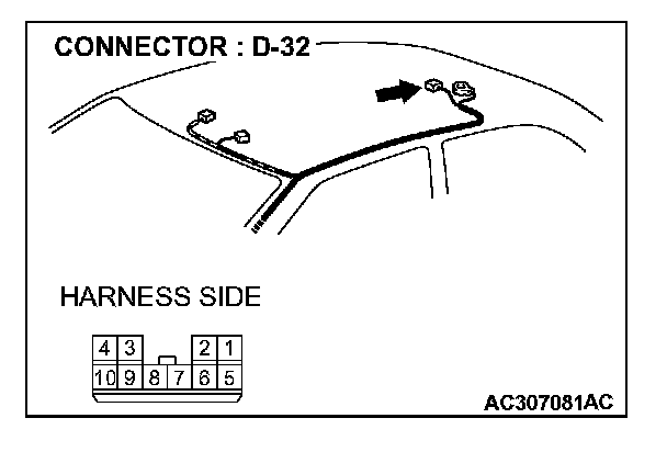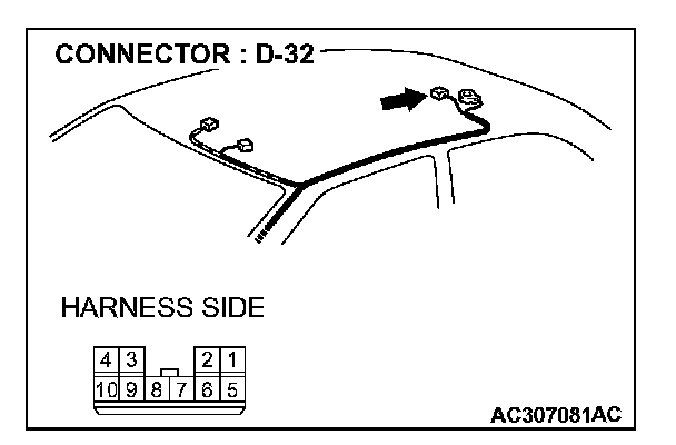 STEP 1. Check the sunroof motor assembly connector D-32 for loose, corroded or damaged terminals, or terminals pushed back in the connector.