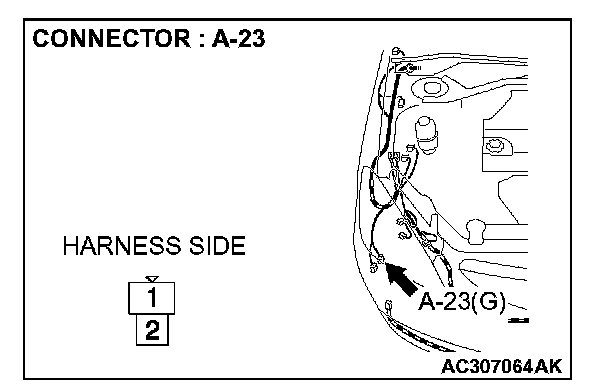 STEP 3. Check rear washer motor connector A-23 for loose, corroded or damaged terminals, or terminals pushed back in the connector.