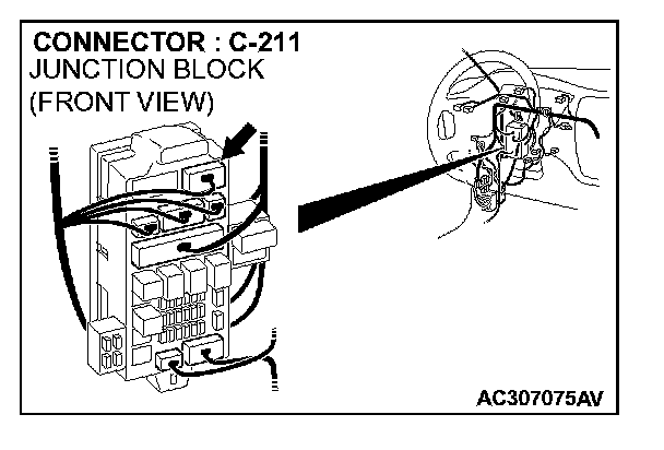 NOTE: Also check junction block connector C-211 for loose, corroded, or damaged terminals, or terminals pushed back in the connector. If junction block connector C-211 is damaged, Repair or replace the damaged component(s) as described in Harness Connector Inspection.