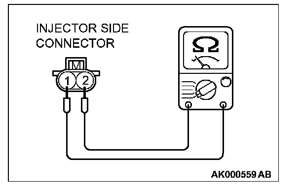 2. Measure the resistance between each injector side connector terminal No. 1 and No. 2.