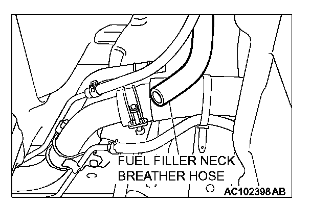 3. If fuel does not leak from the fuel tank filler neck breather hose with the fuel tank full, the leveling valve is normal. If not so, the leveling valve may be defective. Lower the fuel tank from the vehicle and replace the valve.