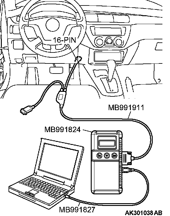CAUTION: To prevent damage to scan tool MB991958, always turn the ignition switch to the "LOCK" (OFF) position before connecting or disconnecting scan tool MB991958.