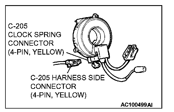 4. Remove the connection between the C-205 clock spring connector (four-pin, yellow) and the harness side connector (four-pin, yellow).