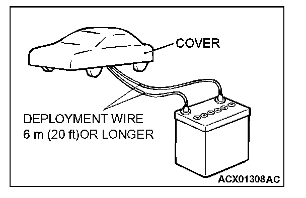 4. Connect deployment wires, each 6 meters (20 feet) or longer, to the two leads of special tool MB686560, and cover the connections with insulation tape. The other ends of the deployment wires should be connected to each other (short-circuited), to prevent sudden unexpected deployment of the air bag module.