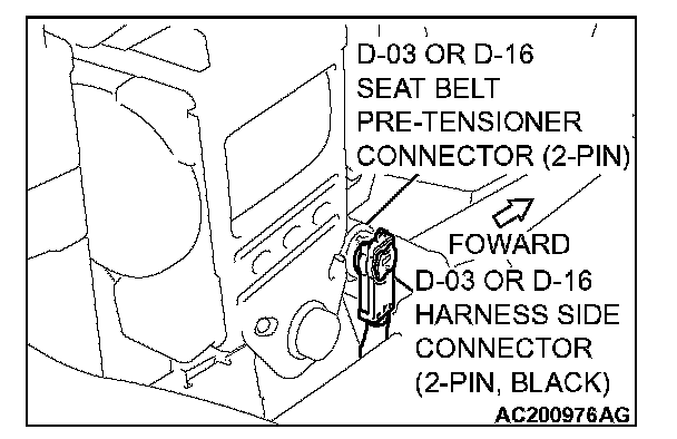 4. Execute the following steps to disconnect the connection between D-03 or D-16 seat belt pre-tensioner connector (two-pin) and harness side connector (two-pin, black).