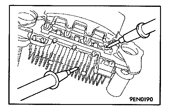 2. Check the continuity between the negative rectifier and the stator coil lead connection terminal with a tester. If there is continuity between the terminals, the diode is grounded, so replace the rectifier.