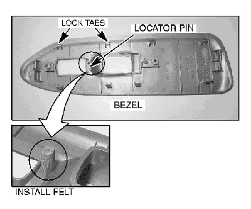 Remove the window switch and bezel from the door panel. Remove the switch from the bezel by removing two screws. Install a small piece of felt around the locator pin as shown