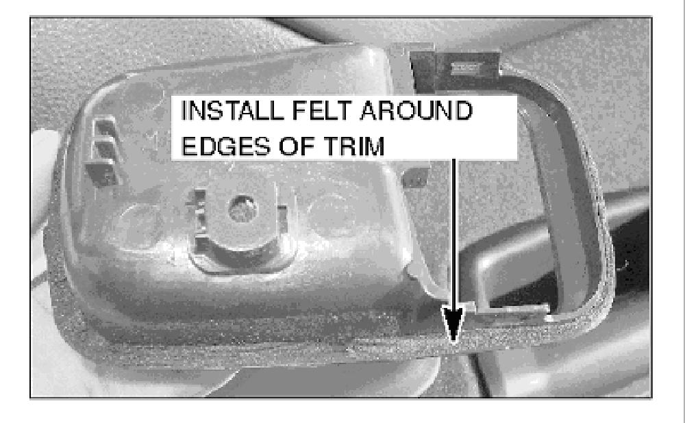 Remove the door release handle and trim from the door. Install a narrow piece of felt around all of the handle trim edges.