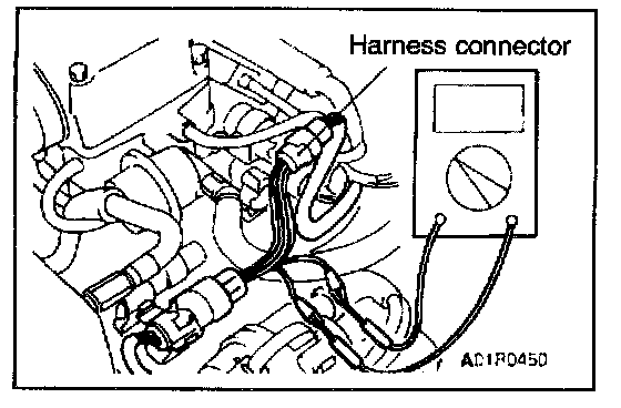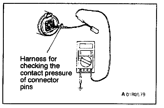 2. If the connector is disconnected for checking and the facing part is the female pin side, the harness for checking the contact pressure of connector pins should be used. Never force the insertion of a test bar, because to do so will cause poor or improper contact.