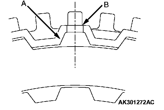 2. Install the clutch reaction plate in the direction shown. Install it the same as the clutch plates, so that the areas with no teeth (marked "A") are aligned with the retainer (marked "B").