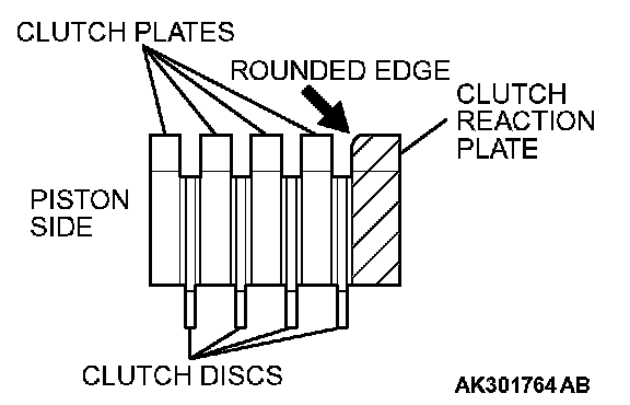 1. Assemble the four clutch plates and four clutch discs one on top of the other inside the underdrive clutch retainer. All four clutch plates should be assembled so that the places with no teeth (marked "A") are aligned with the holes in the retainer (marked "B").