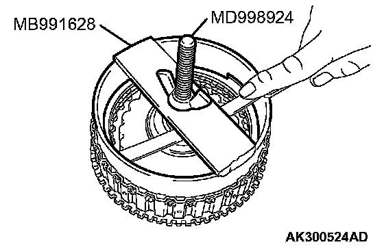 2. Set special tools MB991628 and MD998924 as shown in the illustration, and then compress the clutch element.