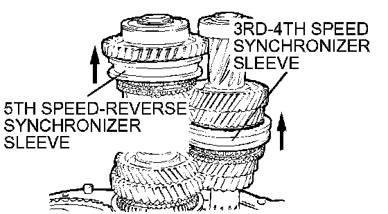 1. Shift the 3rd-4th speed synchronizer sleeve and 5th speed reverse synchronizer sleeve in the direction shown.