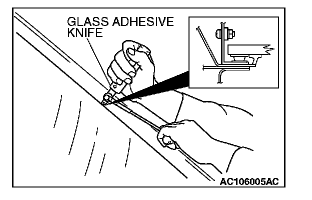 CAUTION: Putting glass adhesive knife too deeply into windshield adhesive may damage windshield.