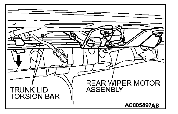 Close the trunk lid slightly and lower the trunk lid torsion bar slightly when removing the rear wiper motor assembly. If you fail to do this, the rear wiper motor assembly will interfere with the trunk lid torsion bar.