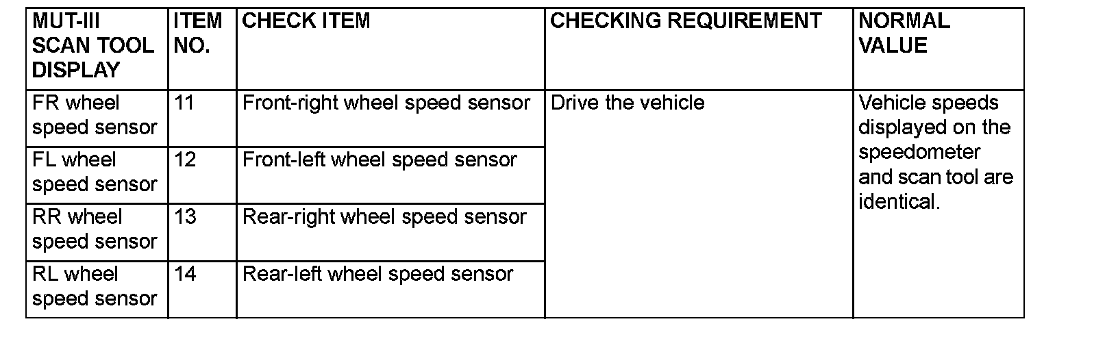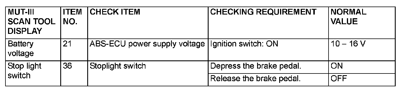 DATA LIST REFERENCE TABLEThe items can be read by the scan tool from the ABS-ECU input data.
