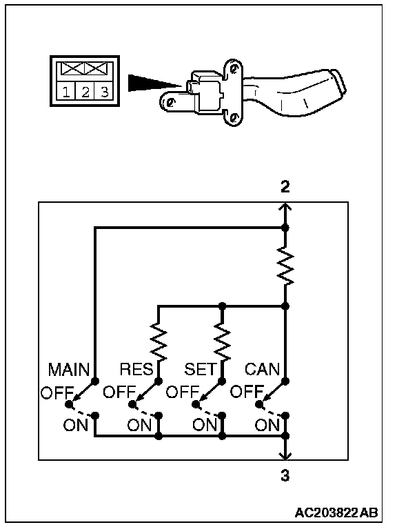 2. Measure the resistance between terminal 2 and terminal 3 when each of the "COAST/SET", "ACC/RES", "CANCEL" and "CRUISE" (MAIN) switches is pressed. If the values measured at the time correspond to those in the table, the resistance values are correct.