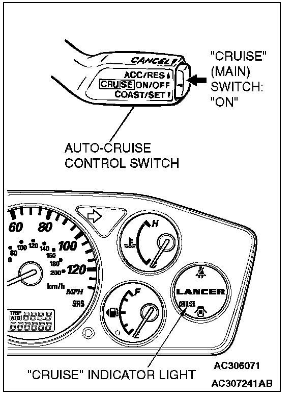 2. Check that the "CRUISE" indicator light within the combination meter illuminates when the "CRUISE" (MAIN) switch is switched "ON".