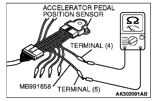 3. Connect the ohmmeter between terminal No. 4 and No. 5 of the accelerator pedal position sensor.