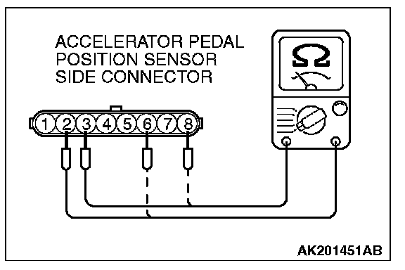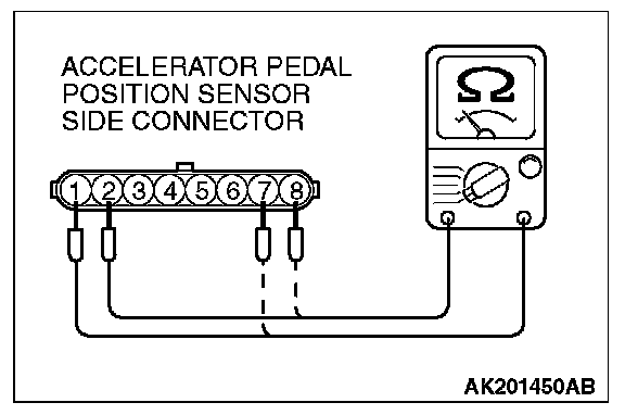 2. Measure the resistance between accelerator pedal position sensor connector terminal No. 1 [accelerator pedal position sensor (main) earth] and terminal No. 2 [accelerator pedal position sensor (main) power supply], and between terminal No.7 [accelerator pedal position sensor (sub) earth] and terminal No. 8 [accelerator pedal position sensor (sub) power supply].