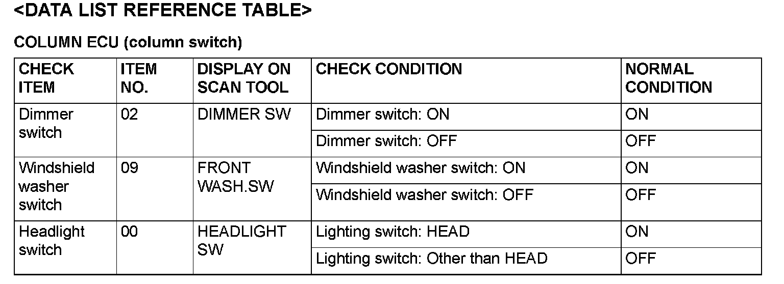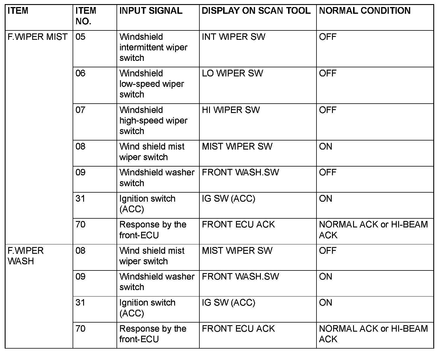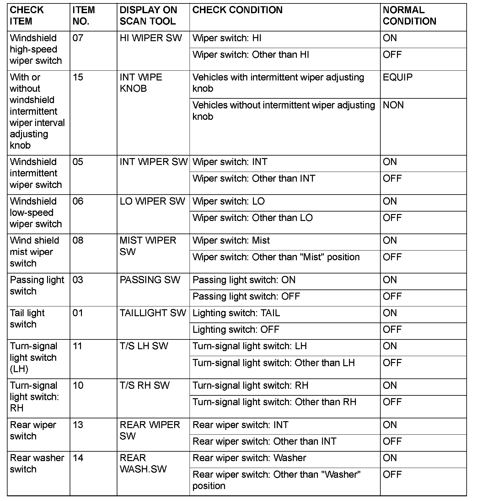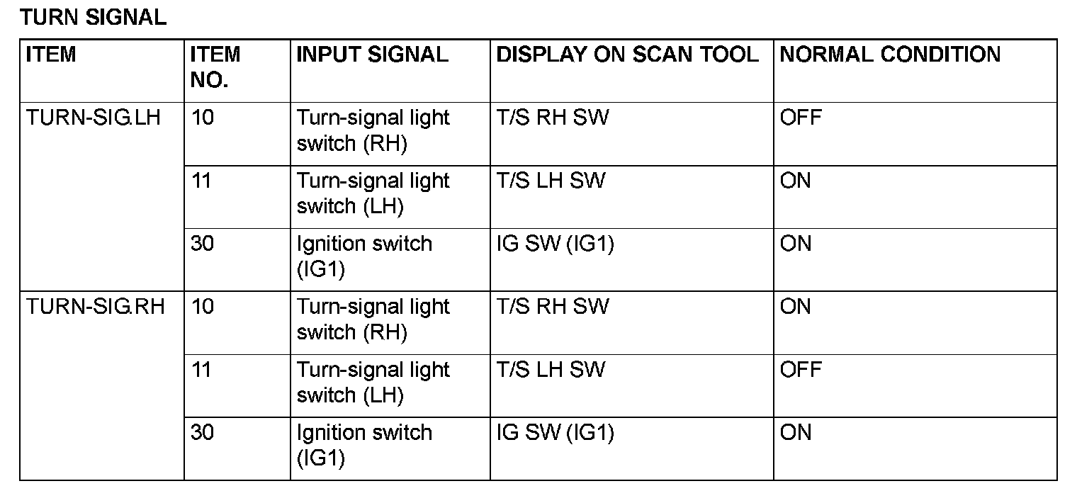 The table shows the service data and their normal condition, which are displayed during the "FUNCTION DIAG." The row "Normal conditions" shows values, which are shown when each operation is made.