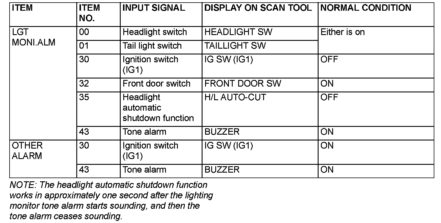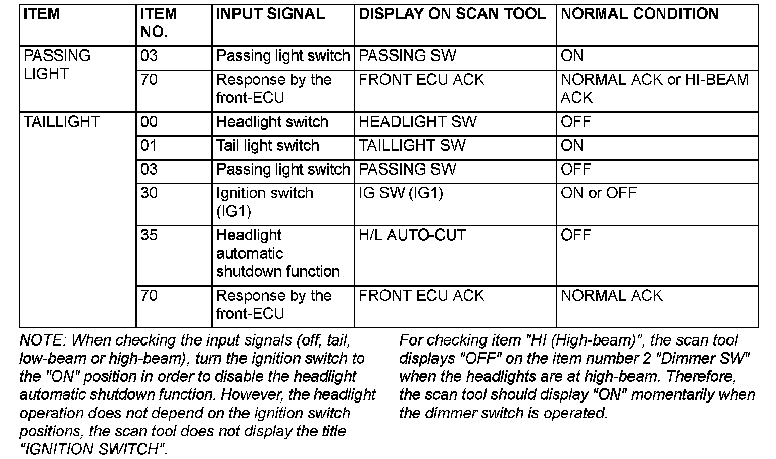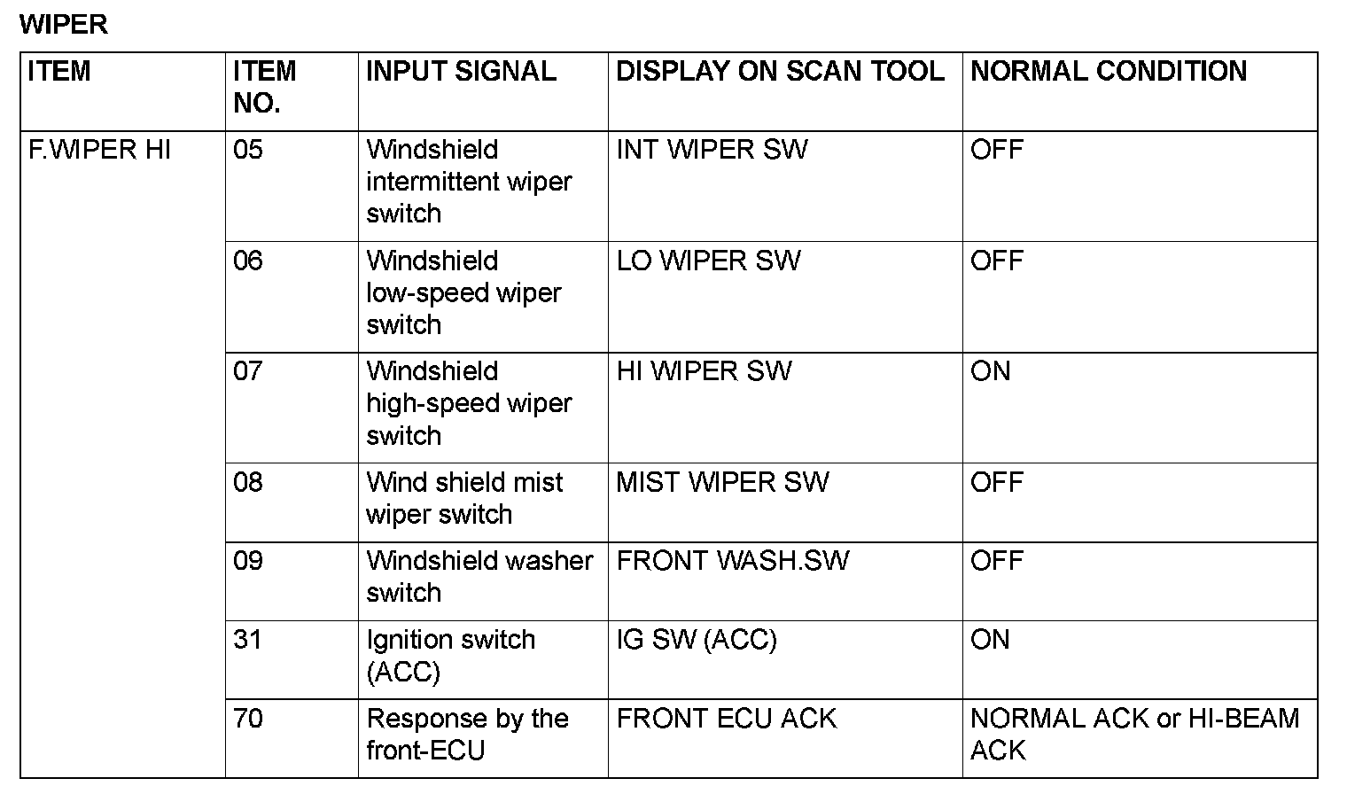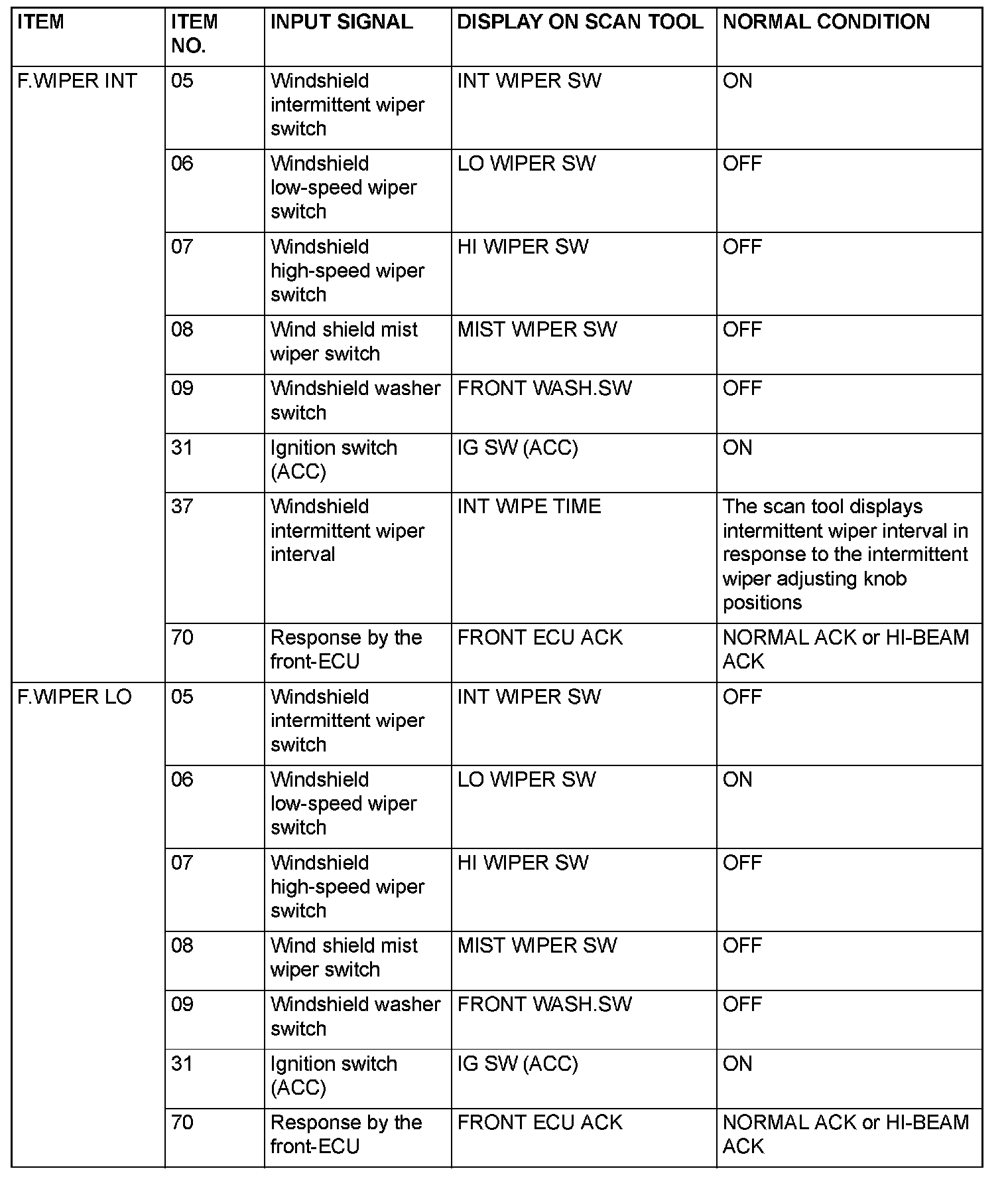 The table shows the service data and their normal condition, which are displayed during the "FUNCTION DIAG." The row "Normal conditions" shows values, which are shown when each operation is made.
