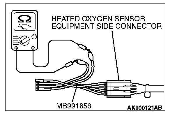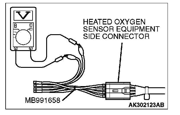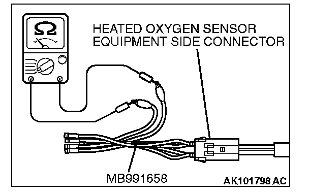 1. Disconnect the heated oxygen sensor connector and connect special tool MB991658 to the connector on the heated oxygen sensor side.