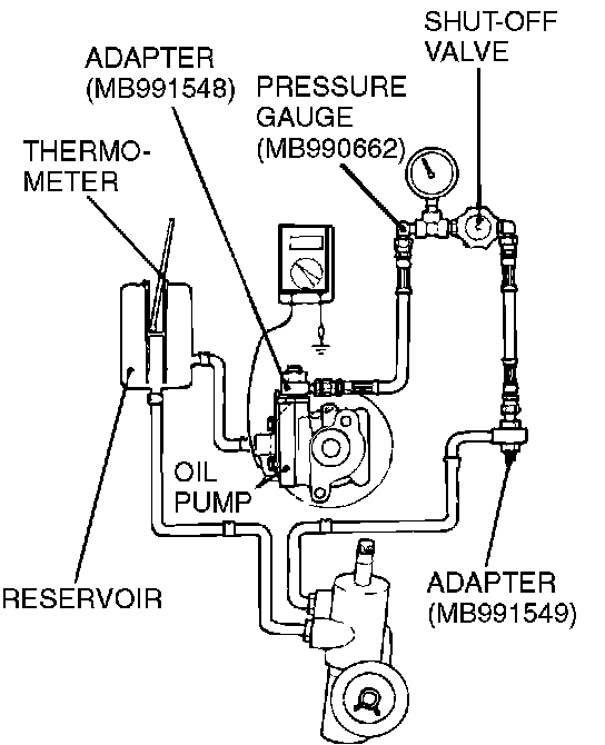 1. Disconnect the pressure hose from the oil pump, and then connect special tools MB991548, MB990662 and MB991549.
