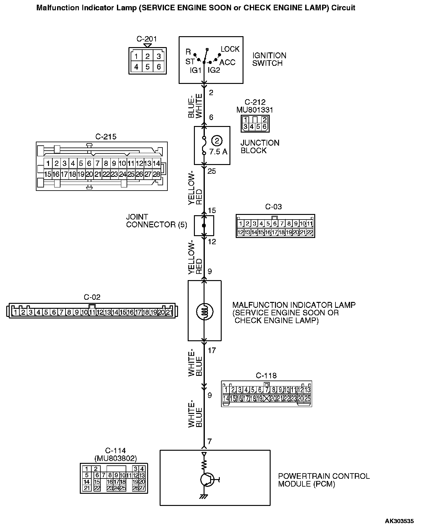 - The PCM controls the ground of the malfunction indicator lamp (SERVICE ENGINE SOON or check engine lamp) by turning the power transistor in the PCM ON and OFF.