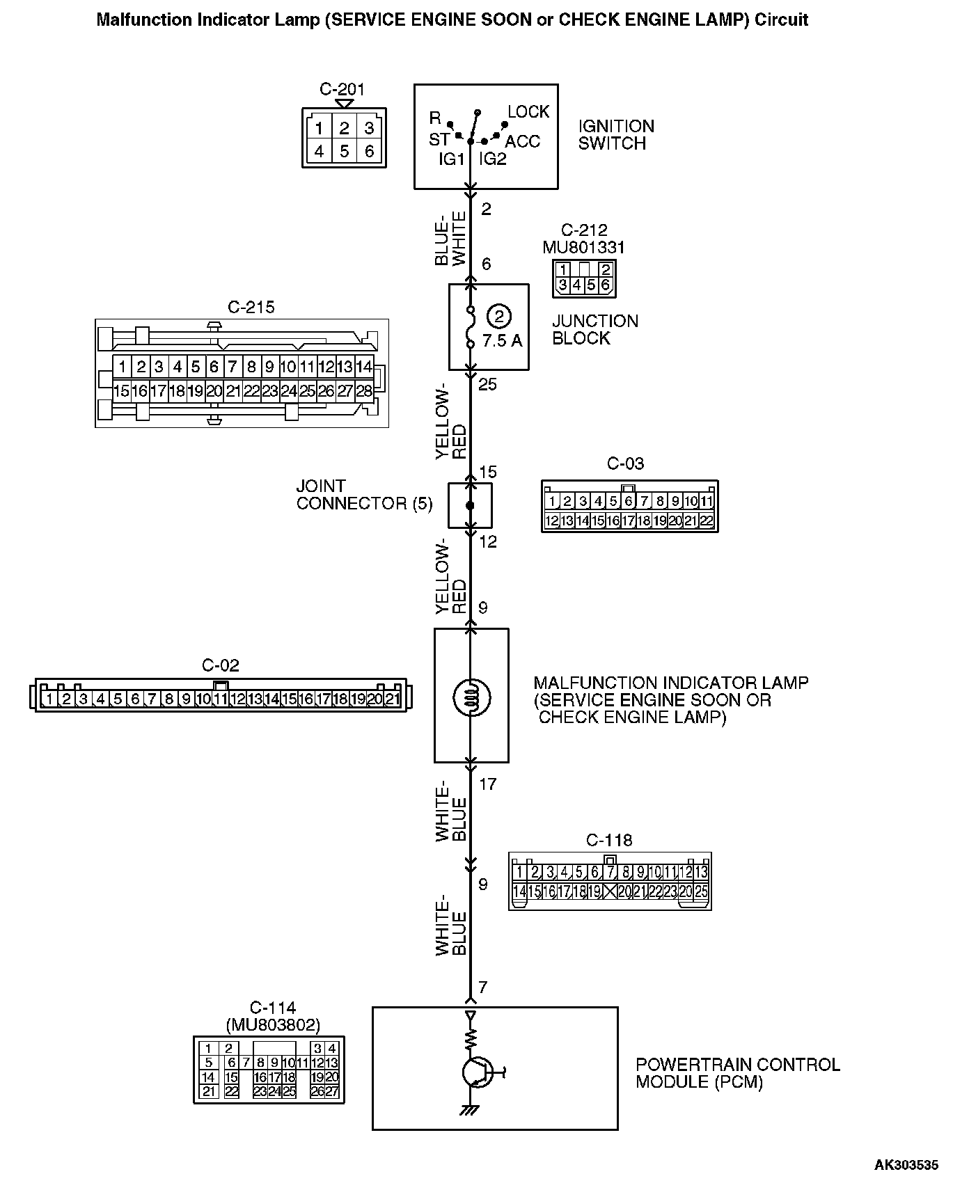 - Short- circuit between the malfunction indicator lamp (SERVICE ENGINE SOON or Check Engine Lamp) and PCM or connector damage.