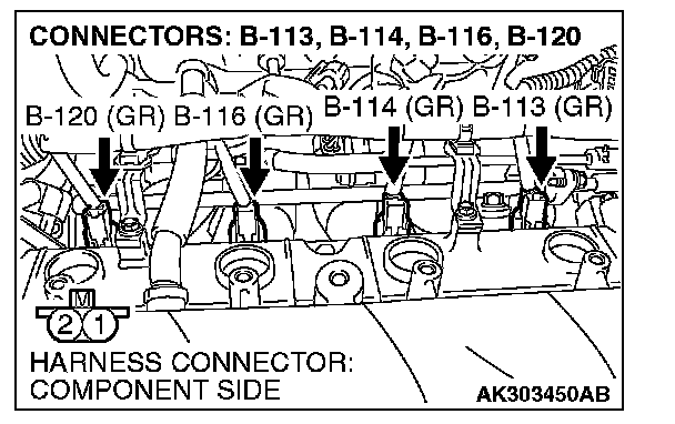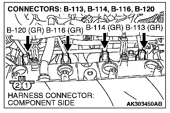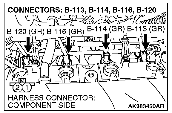1. Disconnect the injector connectors B-113, B-114, B-116 and B-120.