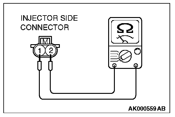 2. Measure the resistance between each injector side connector terminal No. 1 and No. 2.