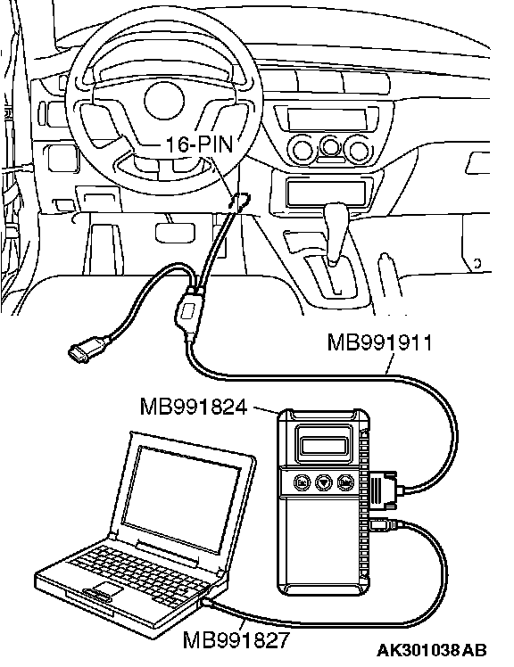 CAUTION: To prevent damage to scan tool MB991958, always turn the ignition switch to the "LOCK" (OFF) position before connecting or disconnecting scan tool MB991958.