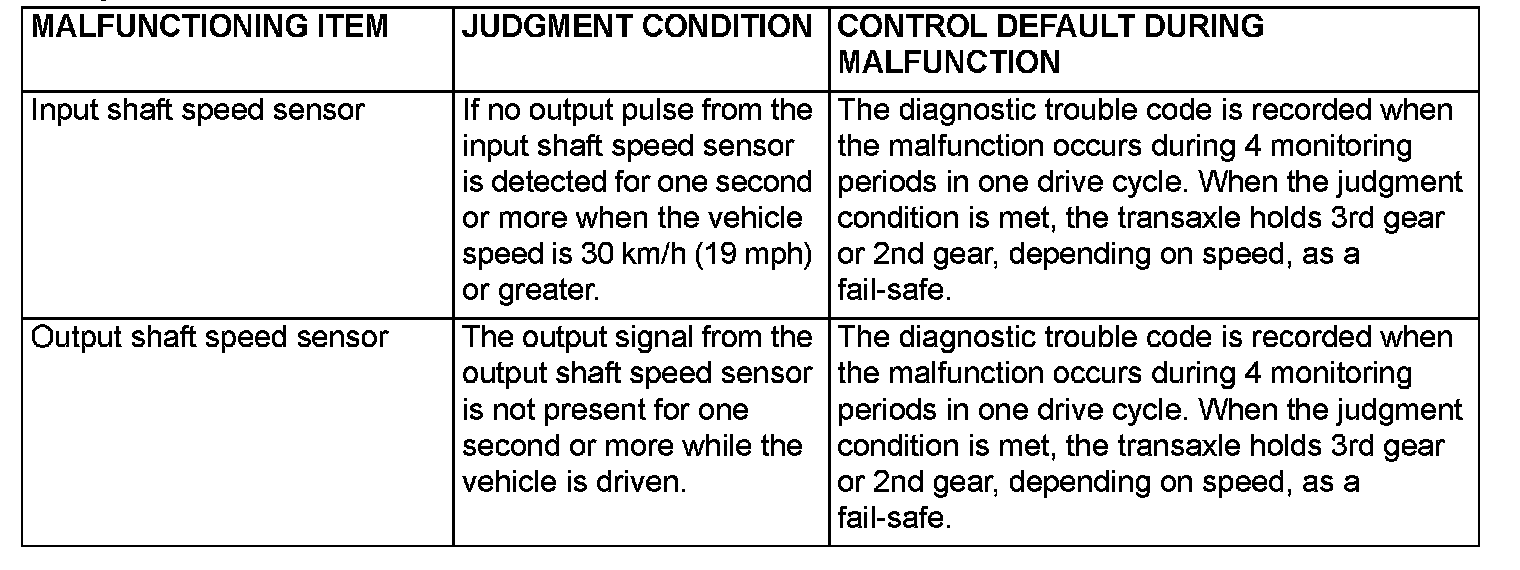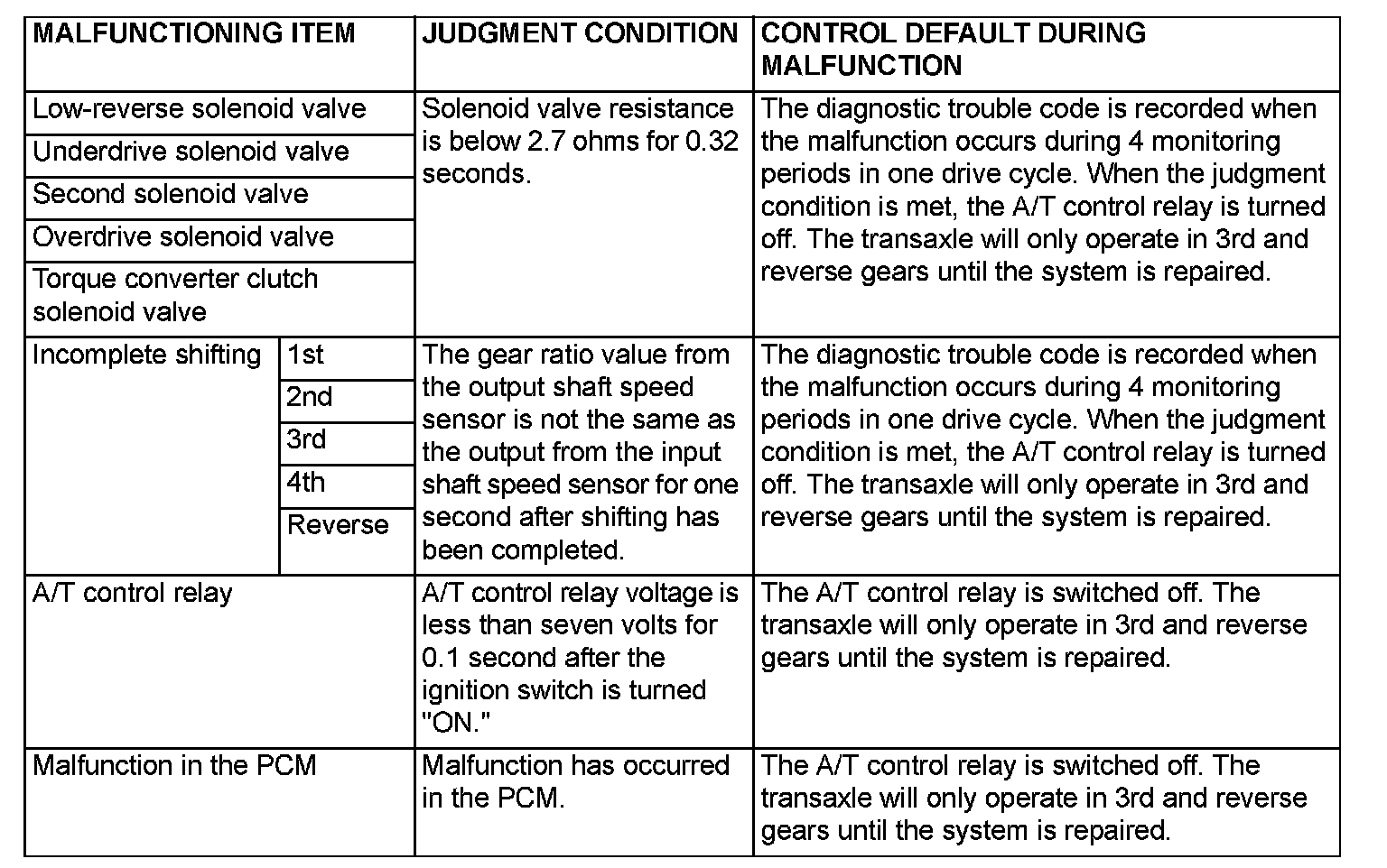 FAIL-SAFE/BACKUP FUNCTIONWhen a malfunction of a main sensor or actuator is detected by the PCM, the transaxle is controlled by pre-set control logic to maintain safe conditions for driving.