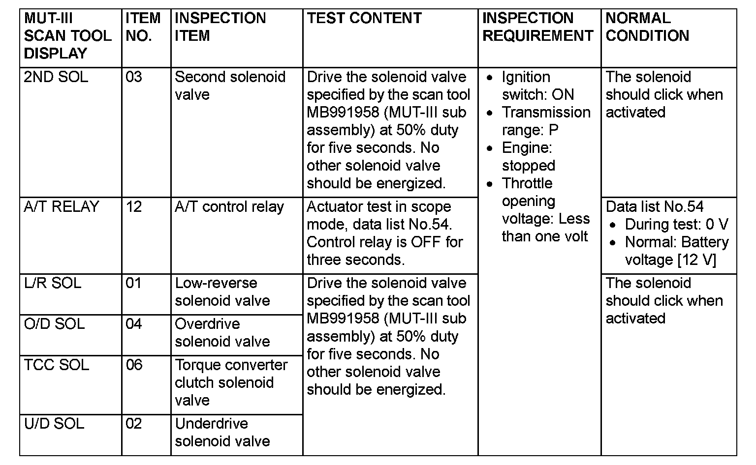 Actuator Test Reference Table
