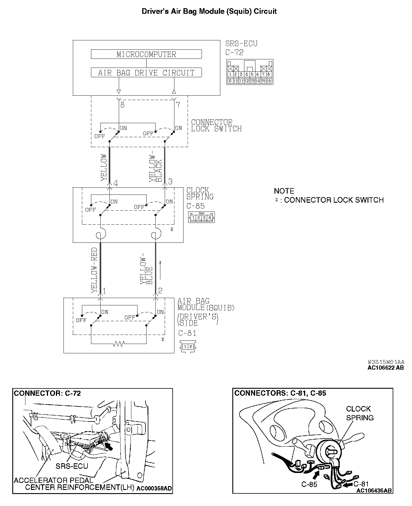 NOTE: *: The squib circuit connectors integrate a "short" spring (which prevents the air bag from deploying unintentionally due to static electricity by shorting the positive wire to the ground wire in the squib circuit when the connectors are disconnected). Therefore, if the connector C-72, C-85 or C-81 is damaged or improperly engaged, the short spring may not be released when the connector is connected.