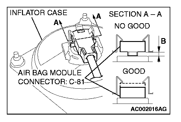 Remove the air bag module mounting equipment and check air bag module connector C-81.At this time, check that there is no gap at place B shown in the illustration.