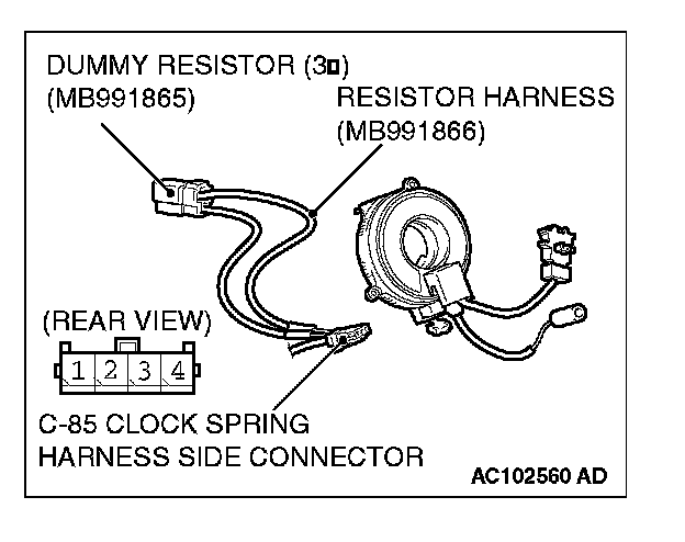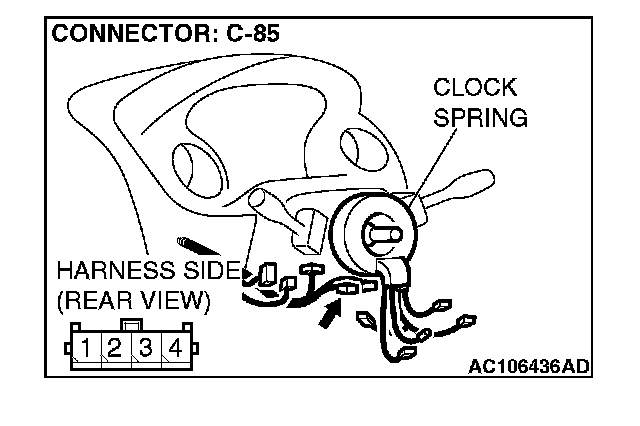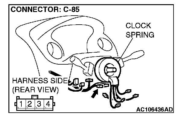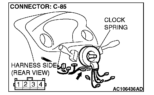 4. Insert special tool MB991866 into clock spring harness side connector C-85 (terminal No.3 and 4) by backprobing.