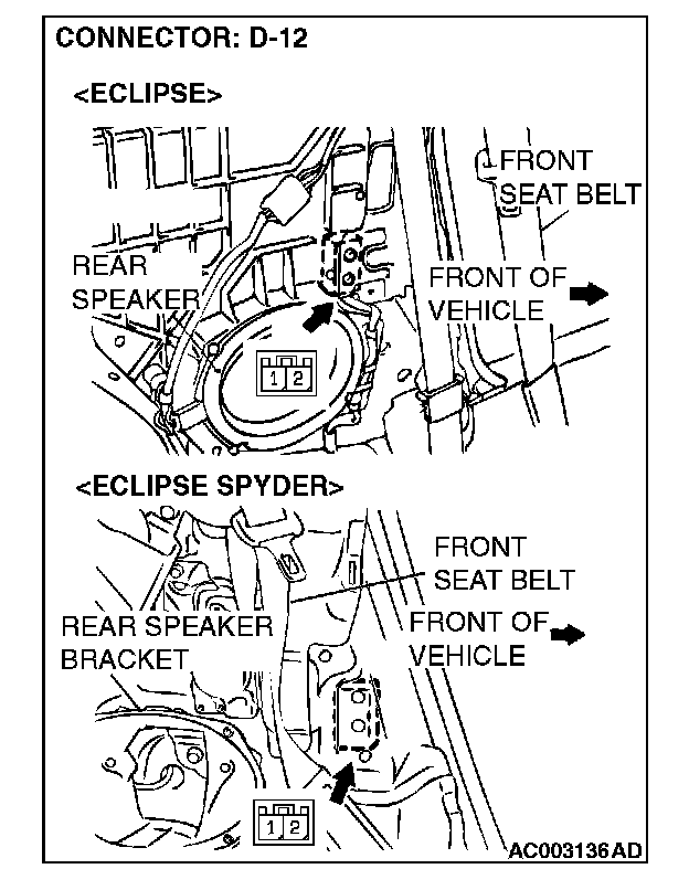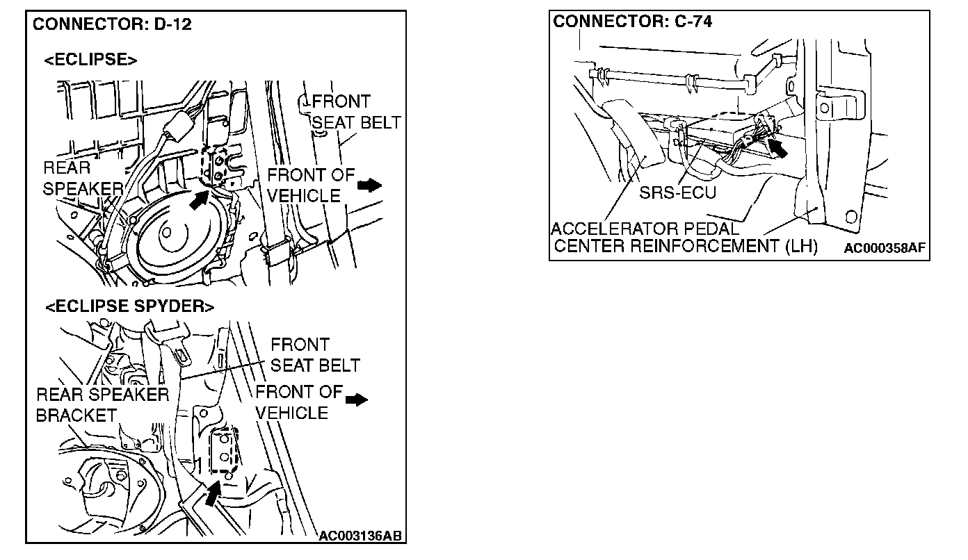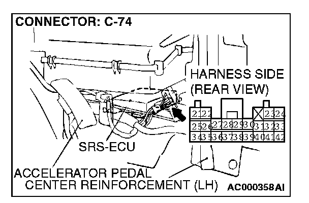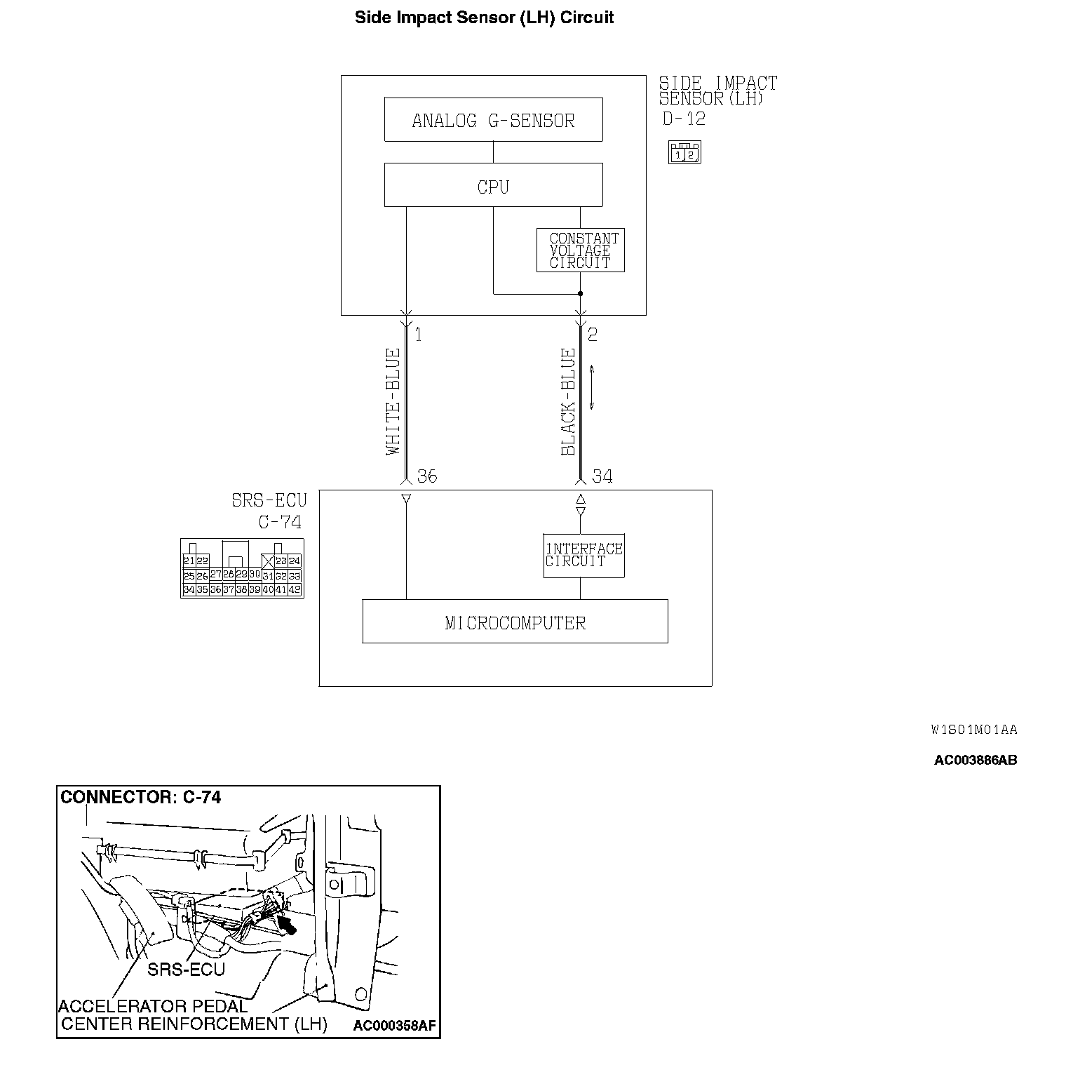 STEP 2. Check the harness wires for open circuit or short circuit between SRS-ECU connector C-74 (terminal No.34 and 36) and side impact sensor (LH) connector D-12 (terminal No.1 and 2).