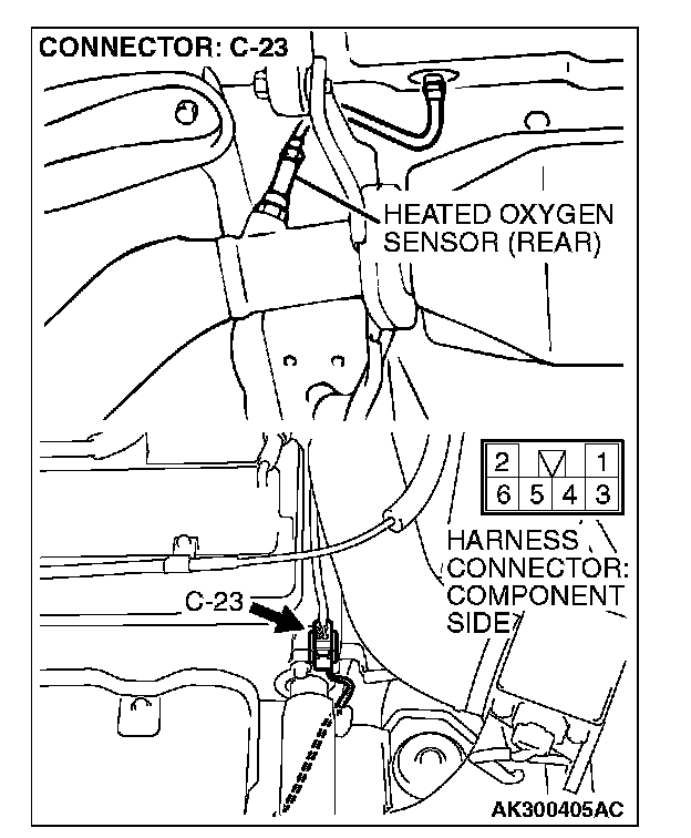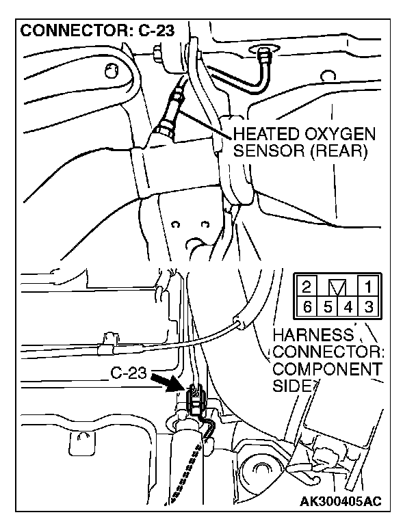 1. Disconnect the heated oxygen sensor (rear) connector C-23 and connect test harness special tool, MB991658, to the connector on the heated oxygen sensor (front) side.