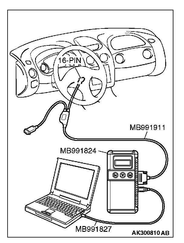 CAUTION: To prevent damage to scan tool MB991958, always turn the ignition switch to the "LOCK" (OFF) position before connecting or disconnecting scan tool MB991958.