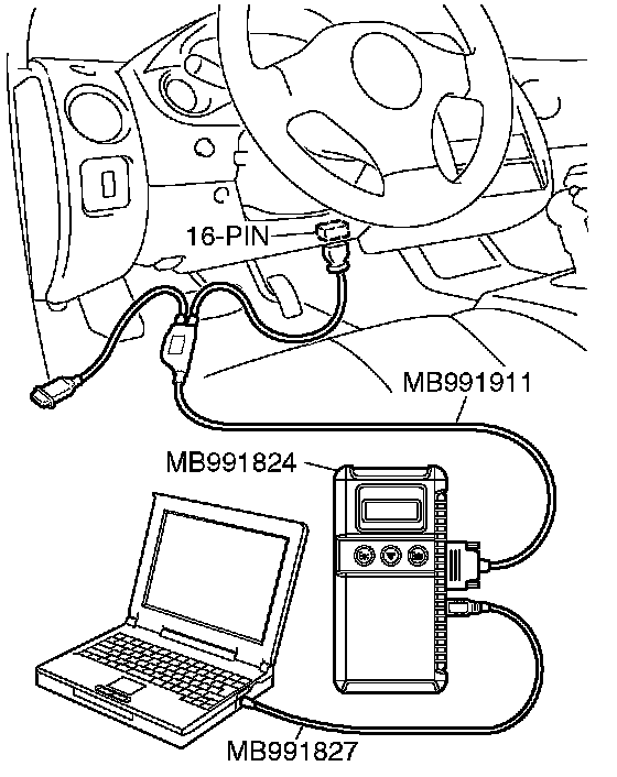 CAUTION: To prevent damage to scan tool MB9911958, always turn the ignition switch to the "LOCK" (OFF) position before connecting or disconnecting scan tool MB9911958.