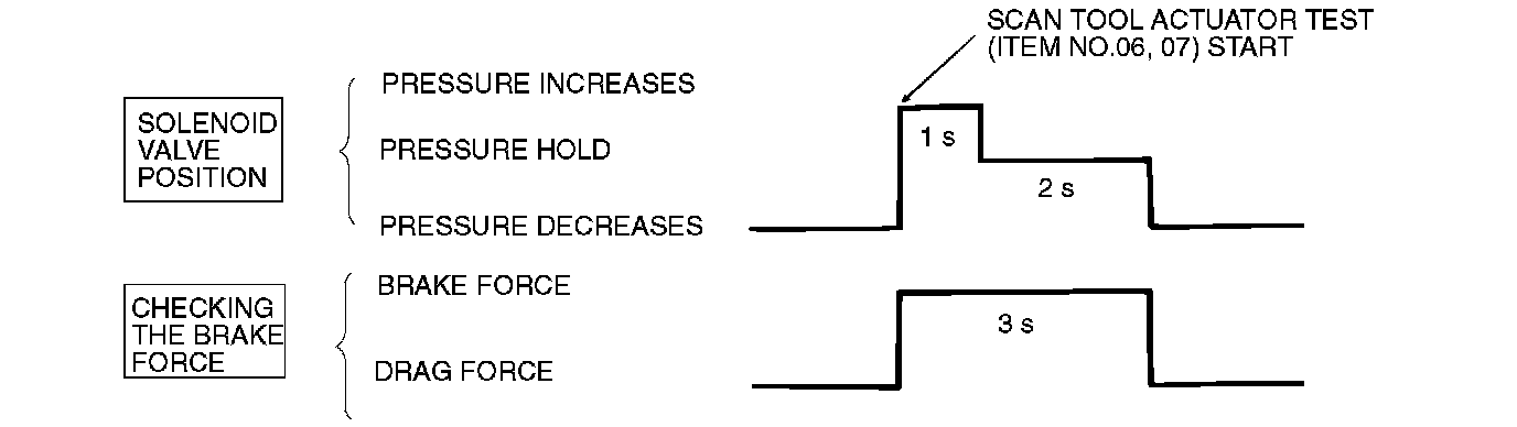 11. Turn the wheel by hand and check the change in braking force. Use a braking force tester. The braking force reading value should change when the actuator test is carried out. The result should be as shown in the diagram above.