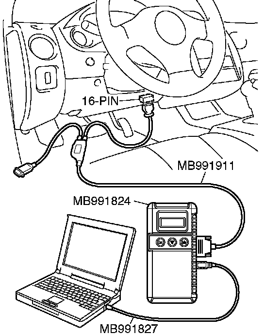 NOTE: Disconnecting scan tool MB991958 is the reverse of the connecting sequence, making sure that the ignition switch is at the "LOCK" (OFF) position.
