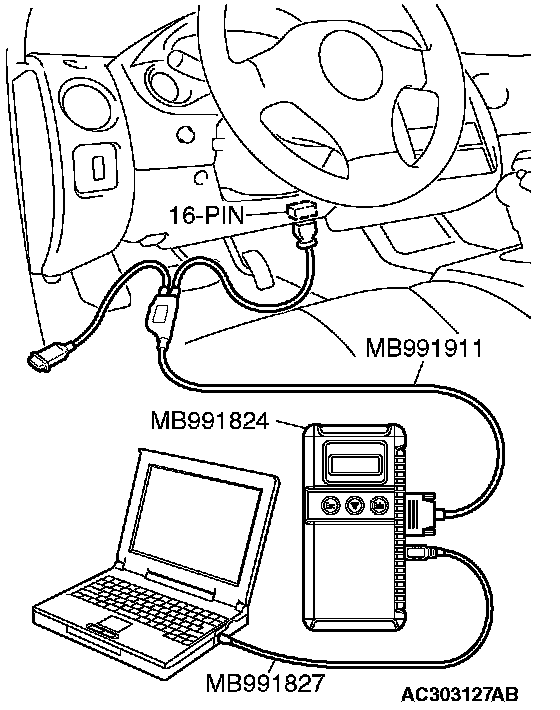 CAUTION: To prevent damage to scan tool MB9911958, always turn the ignition switch to the "LOCK" (OFF) position before connecting or disconnecting scan tool MB9911958.